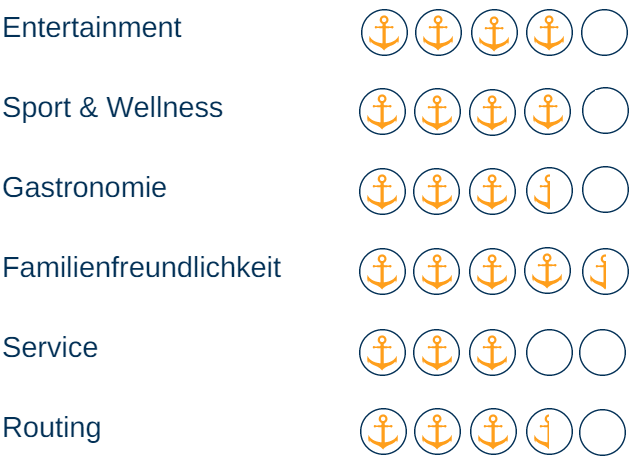 Ein persönlicher Steward ist bei jeder Kabine inklusive und hilft Ihnen bei allen Fragen – dafür gibt es einen Extrapunkt! Die Inklusiv-Restaurants sind nicht ganz so abwechslungsreich und haben daher noch Luft nach oben.