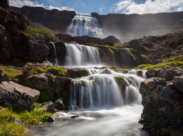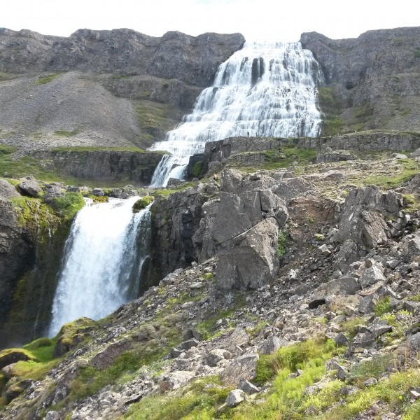 Der majestetische Dynjandi Wasserfall wird nicht umsonst als „Wahrzeichen der Westfjorde“ bezeichnet. Er gehört nicht nur zu den größten Wasserfällen in ganz Island, viele bezeichnen ihn auch als den eindrucksvollsten. Er ist insgesamt beeindruckende 100 Meter hoch und ganz oben bis zu 30 Meter breit. Die Wassermassen stürzen sich deshalb breit aufgefächert in die Tiefe und erzeugen eine enorme Geräuschkulisse, die schon von Weitem hören werden. Nach 100 Metern freiem Fall bilden sich hangabwärts terrassenartig fünf weitere Wasserfälle. Der Aufstieg zum Dynjandi Wasserfall ist leider nicht besonders einfach, er lohnt sich aber allemal.