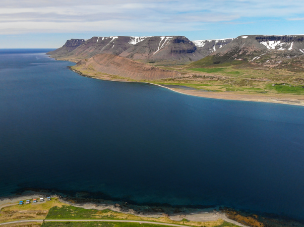 Im weiteren Verlauf empfiehlt sich ein Spaziergang entlang der Küste in Richtung des kleinen Sandstrandes nahe dem Ortsrand. Von hier aus haben Sie einen besonders schönen Blick auf den Fjord und die umliegenden Berge. Die Landschaft wirkt weit und ursprünglich – typisch für die Westfjorde Islands.