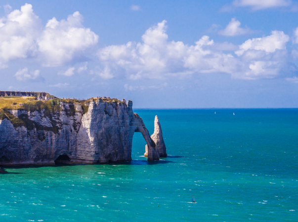 Étretat ist eine französische Gemeinde in der Normandie mit kaum mehr als 1.000 Einwohnern. Bekannt ist dieser Ort vor allem für seine steilen Klippen mit außergewöhnlichen Felsformationen. Zu den Kreidefelsen zählen die drei Felsen Falaise d’Armont, Manneporte sowie Porte d’Aval. Der höchste Punkt liegt bei diesen bei 90 Metern. Eine Felsfront erinnert dabei beispielsweise an einen Elefanten, der seinen Rüssel in das Meer taucht.
