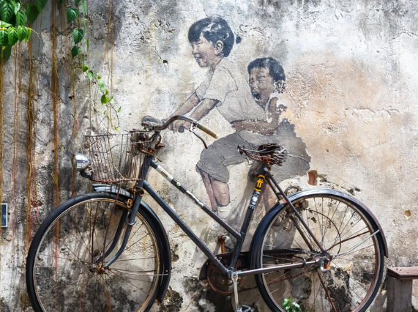 Die Hauptstadt von Penang ist nicht nur aufgrund der vielfältigen Sehenswürdigkeiten einen Besuch wert. Bei einem Spaziergang durch Georgetown werden Sie an fast jeder Ecke die unvergleichliche, inzwischen weltweit bekannte, Streetart entdecken. Jeden Monat tauchen neue, kreative Kunstwerke an den Häuserwänden auf und verpassen der Altstadt ihren einzigartigen Charme. Der Künstler Ernest Zacharevic ist durch seinen speziellen Stil besonders bekannt: Er mixt tolle Wandmalereien mit echten Gegenständen wie beispielsweise Motorrädern, Stühlen oder dem hier abgebildeten Fahrrad. Dadurch entstehen einzigartige Fotomotive, die Sie so nirgendwo sonst finden werden. Halten Sie Ihre Augen bei Ihrer Stadtbesichtigung also unbedingt offen und entdecken Sie möglichst viele der beeindruckenden Kunstwerke.