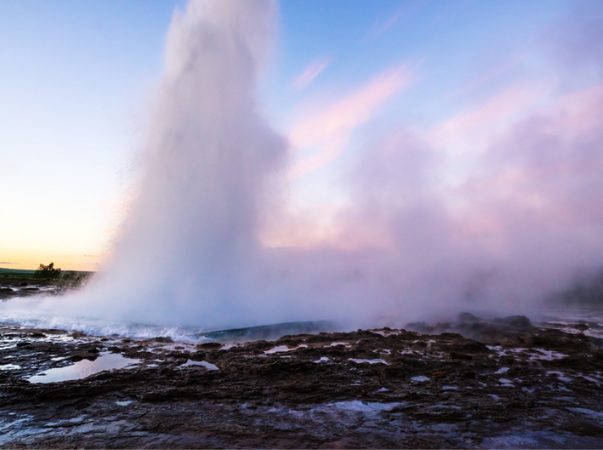Eine weitere berühmte Sehenswürdigkeit des Golden Circles ist der Geysir namens Strokkur, was auf Deutsch „Butterfass“ bedeutet. Geysire sind heiße Quellen, die regelmäßig ausbrechen und kochend heißes Wasser meterhoch in die Luft schießen. Die Ausbrüche des Geysirs Strokkur geschehen alle 5-10 Minuten und bilden Wasserfontänen von 25 bis 35 Metern Höhe. Neben Strokkur existiert auch noch „der große Geysir“, welcher der Namensgeber für alle weiteren Geysire war. Er bricht jedoch nur noch sehr selten aus.