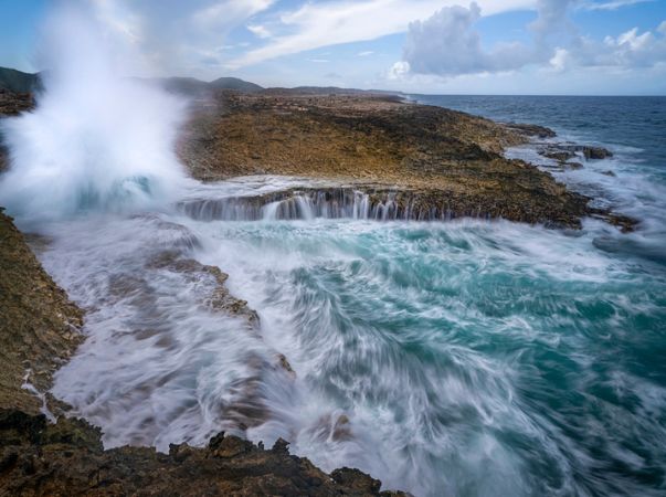 Ebenfalls beeindruckend und tatsächlich völlig anders als der Christoffel Nationalpark, ist der Shete Boka Nationalpark. Dieser liegt auf der rauen Nordseite von Curaçao und zeichnet sich durch schroffe Buchten aus, an denen sich hohe Wellen brechen. Insgesamt gibt es 10 verschiedene Buchten. Wenn Sie den Park besuchen, sehen Sie direkt zu Beginn ein echtes Highlight: in der Bucht Boka Tabla gibt es eine unterirdische Höhle, deren Eingang Sie über eine in den Fels gehauene Treppe erreichen können. Oben angekommen, können Sie sich an den Rand setzen und dem spektakulären Wellenspiel zuschauen. Anschließend können Sie über die Kalksteinklippen laufen und den umwerfenden Blick über die Nordküste der Insel genießen.